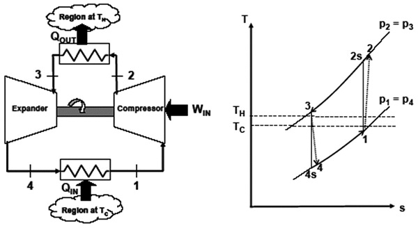 Air cycle refrigeration is based on the reversed Joule (or Brayton) cycle. The ideal cycle considered for air refrigeration cycle is called Bell-Coleman cycle. The schematic diagram for the arrangement of different components of Bell-Coleman cycle has been shown in figure 9(a). The ideal cycle (1-2s-3-4s-1) and also the cycle considering the irreversibilities in the compressor and expander (1-2-3-4-1) have been shown on the temperature-entropy (T-s) diagram in figure 9(b). Air cycles can be classified as closed, open or semi-open/closed. Closed cycles are sealed systems and consequently there is no direct contact between the working fluid and the product being cooled. Open cycles can be open on either the low-pressure side or the high-pressure side of the cycle. Cold air leaving the system passes through the refrigerated space coming in direct contact with the product being cooled. Since air is used as cooling medium, no cost of refrigerant is involved thus making the system quite cheap. Also, as the main compressor is employed for the compressed air source, there is no problem for extra space, extra fixation of the compressor. Also there is no additional vibration. The chilled air is directly used for cooling; the costs of separate evaporator and its weight are eliminated. As the air is refrigerant, minor leakage of the same is tolerated vis-à-vis that of the costly refrigerant. There are no complicated parts involved rendering low maintaining cost. It is light weight per ton of refrigeration compared to other refrigeration system and thus it is used in aircraft refrigeration. On the contrary to the benefits discussed the system shows low COP. Also, there is only sensible cooling and no evaporation of the refrigerant.