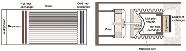 Thermo acoustics is the science which deals with sound and thermal energy. Byron Higgins observed thermo acoustic phenomenon. Hofler built a first thermo acoustic cooler at Los Alamos National laboratory. The thermo acoustic refrigeration systems use sound waves to produce cooling effect. The cooling effect is achieved through compressing and expansion of an inert gas such as helium, argon, air or a mixture of gases in a resonator. The thermo acoustic devices are mainly divided into standing wave systems and traveling wave systems and are shown in figures 8(a) and 8(b) respectively. The main components in standing wave systems are a closed cylinder, an acoustic driver, a porous media called stack, and two heat exchangers. In standing wave system, a loudspeaker produces sound waves which are used to create a resonant standing wave inside the stack. A temperature difference along the length of the stack is produced as gas oscillates within the stack, due to expansion and compression by the sound wave. On the other hand for traveling wave system, the driver is a motor and piston. The temperature difference for this system occurs in a regenerator rather than a stack unlike in stand wave system. The regenerator consists of a matrix of small channels. As the pressure is increased and decreased, the air will oscillate between the hot and cold heat exchangers through the regenerator matrix. When the pressure is high, the gas moves towards the hot heat exchanger and when the pressure is low, it moves towards the cold exchanger, thereby transferring heat. The acoustic refrigeration technology is most suitable for low capacity equipment. The main benefit of the technology is that it uses environmentally safe, inert gases such as air, argon, and helium. The inefficiency of systems which have been already built and tested is a result of inadequate tolerances in assembled apparatus. Also, the heat exchangers were found to be the cause for high cost and complexity.