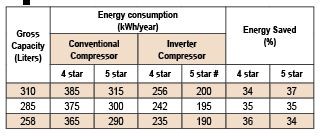 Note: Few Refrigerators were tested at UL Manesar Lab and based on result percentage saving calculated and highlighted. Additionally for outcome compressor is not the only factor, refrigerant used too are different. Refrigerant (134 a) was used in a conventional compressor while (600-a) was used in inverter compressor.