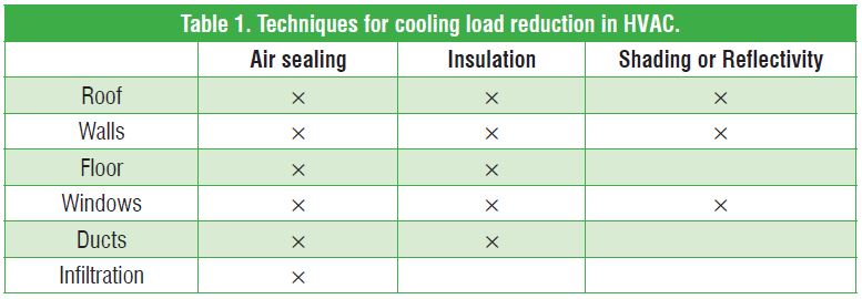 The building surface provides a barrier among the indoor space and outside climate. The building external cooling load greatly depends upon exposure of wall, roof and windows to outdoor ambient. While the internal cooling load depends upon the heat and moisture produced by the occupants as well as appliances and activities associated with daily living. The cooling loads are what drive HVAC design and capacity. One important distinction between heating load and cooling load is that heating loads are based purely on thermal energy transfer driven by the temperature differences. Cooling loads, on the other hand, related two distinct components like as one thermal and the other moisture related. These components are described more preciously as the sensible and latent portions of the cooling load respectively. The sensible cooling load is the most dominant in residential HVAC applications. Three basic cooling load reduction strategies mostly employed to optimise HVAC design are air sealing, insulation and shading or reflectivity. The following Table 1 shows how each technique applied to control the cooling load of HVAC.