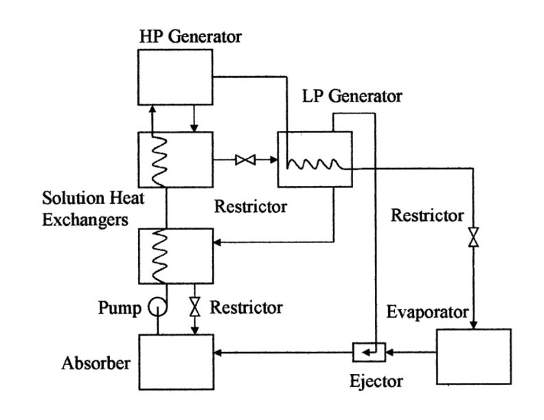 In the cycle, the ejector is driven by vapour from the low-pressure generator of a double-effect absorption cycle. This cycle increases the temperature lift and eliminates the need for a condenser, but the CoP is not improved.