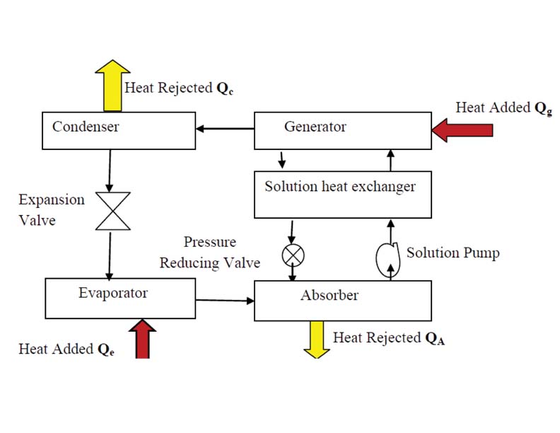 In the vapour absorption refrigeration system, a physicochemical process replaces the mechanical process of the vapour compression refrigeration system by using energy in the form of heat rather than mechanical work. The main advantage of this system lies in the opportunity of utilising waste heat energy from industrial processes or other sources like solar energy as an energy input.