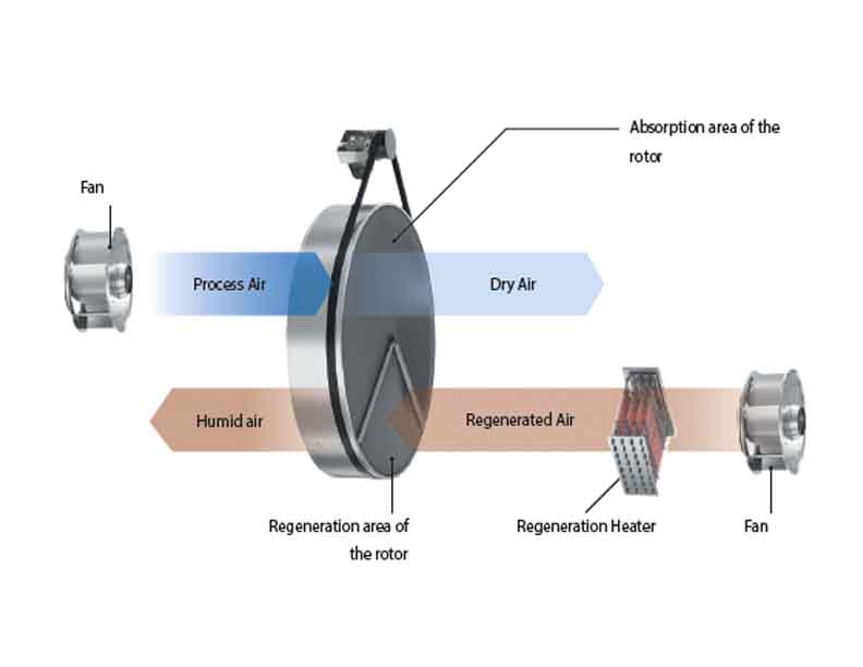 Adsorption dryers are used when a moisture content of less than about 45% RH is required, often at very low temperatures. In this application, condensing dehumidification of the air would be too costly and energy-intensive. An adsorption dryer consists of a sorption rotor, air filters, two fans for conveying the process air and the regeneration air, a heater for heating the regeneration air and the associated control system (see figure 3). The use of Adsorption dryers is not limited to humidity levels below 45% or applications at low temperature. Any form of condensing dehumidifier will typically give control in the order of +/-10% either side of set point. Whereas desiccant adsorption driers will control to +/-2% RH.