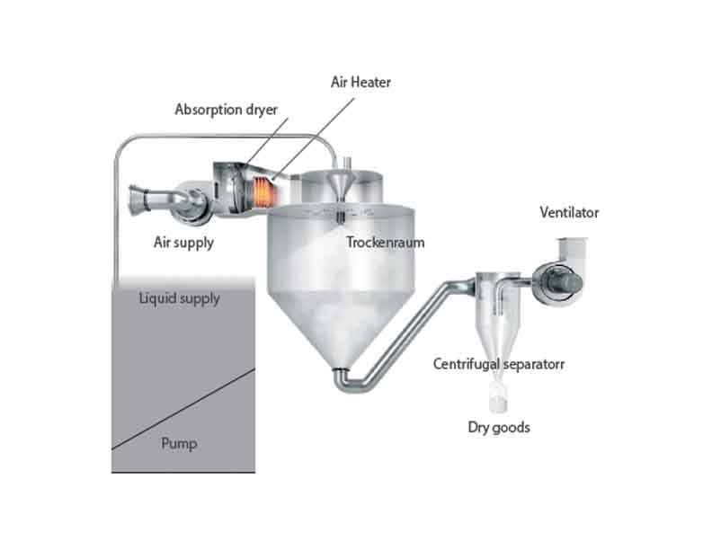 Spray-drying is commonly used in the food industry where liquid products are turned into powders as shown in Figure 2. These are either then sold as finished goods or are used as basic substances for the production of other products. Spray dried products include powdered milk and instant coffee.