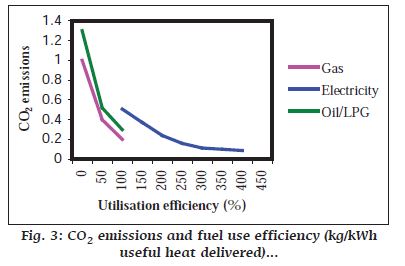 The high seasonal efficiency of the GSHP systems reduces the demand for purchased electricity and the associated emissions of CO2 and other pollutants. Figure 3 shows the relationship between utilisation efficiency and CO2 emissions for different domestic fuels. For example, it can be seen that, assuming an average CO2 emission factor for electricity of 0.414 kg/kWh, the use of a GSHP with a seasonal efficiency of 350% would result in the emission of 0.12 kg CO2 for every kWh of useful heat provided.